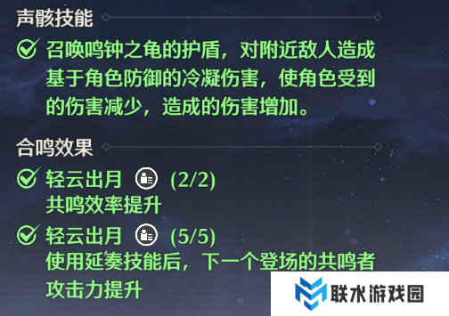 可以选择【鸣钟之龟】,基于防御力造成伤害,同时减少角色受到的伤害和增加角色造成的伤害。当然声骸技能也可以使用【坚岩斗士】提供护盾,看个人选择。