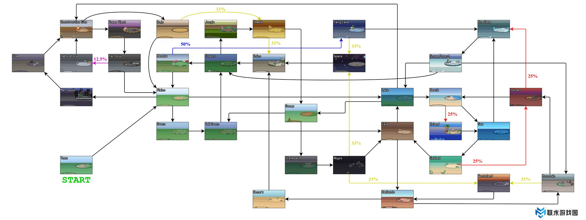 举例,从草地(地图左上角)开始,有50%的机会下一个生物群系是妖精洞穴: