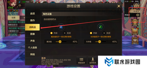 Tip:手游中有一个自动使用药剂的功能,可以有效避免我们在打斗过程中忘记吃药,点击主界面的设置,打开消耗品,就可以开启或关闭自动使用药剂功能。