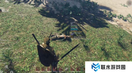 4、需要注意的是,因为该蛮人的生命值已经处于一个很低的状态,所以如果之前玩家是使用的双刀等流血武器攻击该蛮人,那么他此时可能处于【流血】状态,这个时候需要对准该蛮人,长按【E】键,打开蛮人背包,将【绷带】放到蛮人的背包中,按【E】使用【绷带】,就可以恢复蛮人的生命值了。