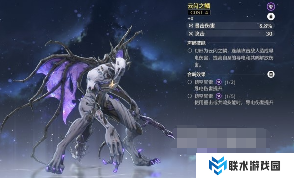 声骸技能:使用声骸技能,幻形为云闪之鳞,穿梭攻击,可连续使用最多6次,前5次每次造成132.61%导电伤害,终结一击造成189.44%导电伤害,落雷造成31.57%导电伤害。终结一击命中后,自身导电伤害加成提升12.00%,共鸣解放伤害加成提升12.00%,持续15秒。