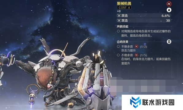 声骸技能:使用声骸技能,对周围的敌人造成一次48.64%的导电伤害,并召唤聚械废料攻击敌人。废料命中目标时会造成320.00%的导电伤害,并在一段时间后爆炸,造成160.00%的导电伤害。施放声骸技能后,自身攻击提升12.00%,持续15秒。废料造成的伤害会被视为延奏技能伤害。