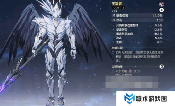 声骸技能:使用声骸技能,幻形为无冠者,可连续使用最多4次,前2次均造成一段134.08%的湮灭伤害,第3次造成两段100.56%的湮灭伤害,第4次造成三段67.04%的湮灭伤害。幻形后,自身湮灭伤害加成提升12.00%,共鸣技能伤害加成提升12.00%,持续15秒。