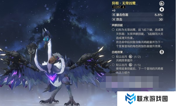 声骸技能:使用声骸技能,幻形为无常凶鹭,起飞后下砸,造成310.56%的湮灭伤害;长按声骸技能,持续幻形,起飞后向下倾泻湮灭火炎,每段攻击造成55.73%的湮灭伤害。幻形后首次命中敌人,回复自身10点共鸣能量;在此后15秒内,若自身施放延奏技能,则可使下一个变奏登场的角色伤害提升12%,持续15秒。