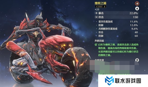 声骸技能:短按声骸技能,幻形为燎照之骑发动斩击,可连续使用最多3次。分别造成242.40%、282.80%、282.80%的热熔伤害。最后一段命中敌人后,自身热熔伤害加成提升12.00%,普攻伤害加成提升12.00%,持续15秒。长按声骸技能,持续幻形为燎照之骑并进入骑行状态,结束时对前方的目标造成一次282.80%的热熔伤害。