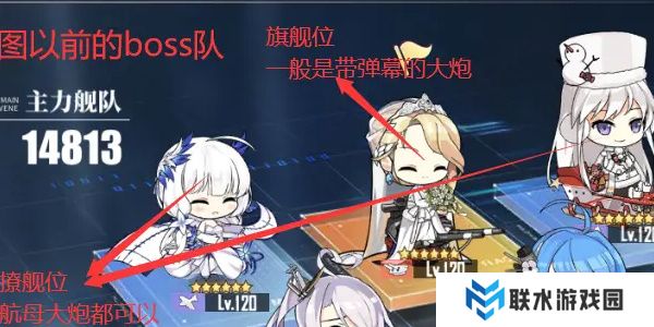 第一行左侧与右侧可为航母或大炮,中间为旗舰位,一般为黛弹幕的大炮。