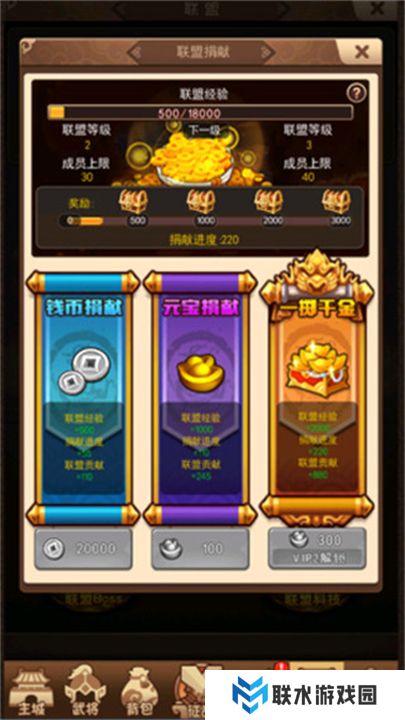 每个成员每天可捐赠一次银币或元宝,捐献将提升联盟实力,达到一定捐献值后可获得回馈奖励。