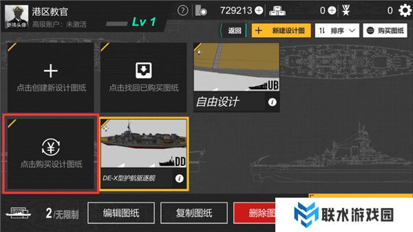 1. 对于新手玩家,还可以选择购买其他提督的图纸或获取建造授权。点击“购买设计图纸”按钮进入图纸交易大厅,浏览并购买其他提督的设计。您还可以查看这些设计图纸并进行模仿或改进。